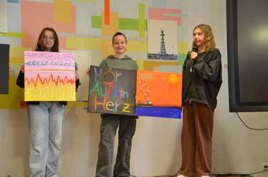 Dann ging es für die Schülerinnen in Kleingruppen in die Workshops, die die Lehrkräfte und pädagogischen Mitarbeiterinnen und Mitarbeiter der Einrichtung vorbereitet hatten. „Special Guest“ Bischof Dr. Franz Jung, wie die Mädchen und jungen Frauen ihren besonderen Gast nannten, schloss sich einer Gruppe von sechs Schülerinnen an, die sich dem Thema „Demokratie“ gemeinsam mit drei Lehrkräften auf künstlerische Weise annäherten. Dazu hörten sie zunächst die kleine Geschichte „Im Land der Demokratie“, aus der jede Schülerin einen Begriff oder einen Satz, welcher ihr besonders nachdrücklich im Gedächtnis geblieben war, benennen sollte. Zu diesen Begrifflichkeiten gestalteten die Schülerinnen anschließend kreative Kunstwerke auf Leinwänden. Auch Bischof Dr. Franz Jung machte sich mit Filzstiften und Acrylfarben ans Werk. Die fertigen Kunstwerke präsentierten die Schülerinnen, Bischof Jung und Judith Wünn, die ebenfalls an dem Workshop teilgenommen hatte, später in der Aula, wo alle Ergebnisse aus den verschiedenen Workshops zusammengetragen und vorgestellt wurden.