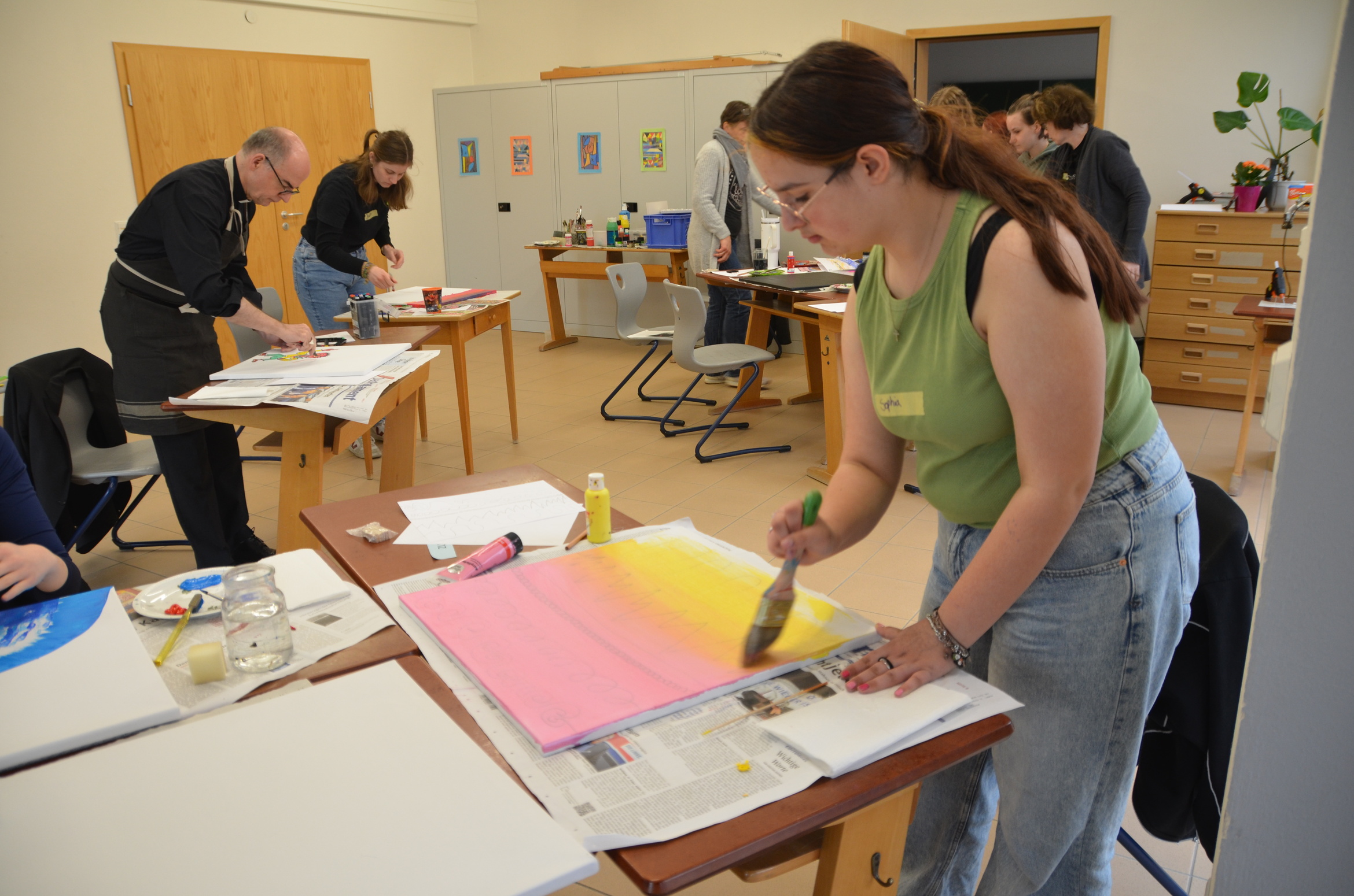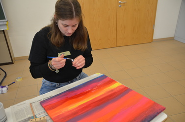 Dann ging es für die Schülerinnen in Kleingruppen in die Workshops, die die Lehrkräfte und pädagogischen Mitarbeiterinnen und Mitarbeiter der Einrichtung vorbereitet hatten. „Special Guest“ Bischof Dr. Franz Jung, wie die Mädchen und jungen Frauen ihren besonderen Gast nannten, schloss sich einer Gruppe von sechs Schülerinnen an, die sich dem Thema „Demokratie“ gemeinsam mit drei Lehrkräften auf künstlerische Weise annäherten. Dazu hörten sie zunächst die kleine Geschichte „Im Land der Demokratie“, aus der jede Schülerin einen Begriff oder einen Satz, welcher ihr besonders nachdrücklich im Gedächtnis geblieben war, benennen sollte. Zu diesen Begrifflichkeiten gestalteten die Schülerinnen anschließend kreative Kunstwerke auf Leinwänden. Auch Bischof Dr. Franz Jung machte sich mit Filzstiften und Acrylfarben ans Werk. Die fertigen Kunstwerke präsentierten die Schülerinnen, Bischof Jung und Judith Wünn, die ebenfalls an dem Workshop teilgenommen hatte, später in der Aula, wo alle Ergebnisse aus den verschiedenen Workshops zusammengetragen und vorgestellt wurden.